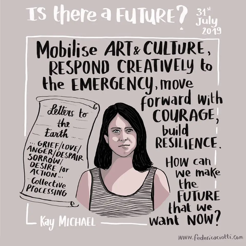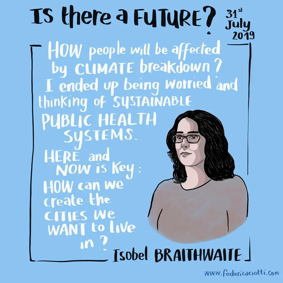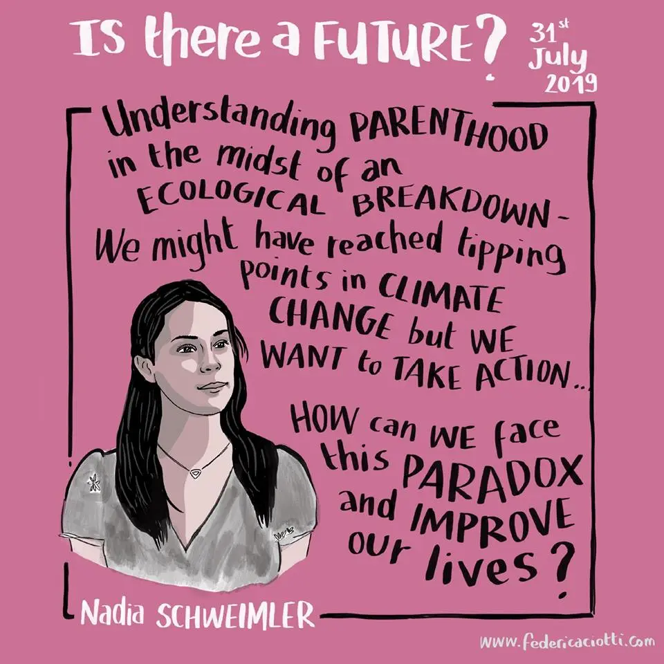 You may recall on 31st July, long time member Cecile Embleton curated an exhibition Is there a future? featuring our cofounder Sylvie Barbier. You can get a glimpse of the extraordinary night in London here in this collection of photos. A film is to follow that will feature the live performances as well as talks from Procreate Project, Birth Strike, Extinction Rebellion Families Coordinator, Izzy Braithwaite (a doctor), Nadia Schweimler, Senior Advisor on Climate Innovation, and Culture Declares Emergency. These illustrations by Federica Ciotti capture some points.