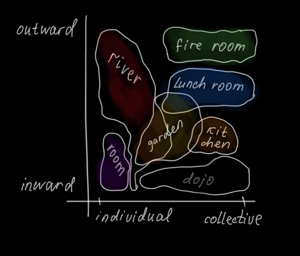 While initially relatively foreign to me, these reflections took a vivid meaning during the residency. Not so much because we would talk about CA - we actually mostly did not specifically talk about these concepts themselves, apart from maybe 2 sharing circles out of ~20. Instead, we constantly touched on these topics as a byproduct of our other activities. It even became clear, as we were progressing through the residency, that the monthly gathering itself was what the residency was about. Put in other words, the residency was not about contemplative activism, it was contemplative activism. It was not about sitting with the trouble. It was sitting with the trouble. By creating space for emotional sharings and communal intimacy to flourish, the residency created a moment, out of space and time, for participatory knowing to take over propositional knowing in our quest to communicate, understand and learn.