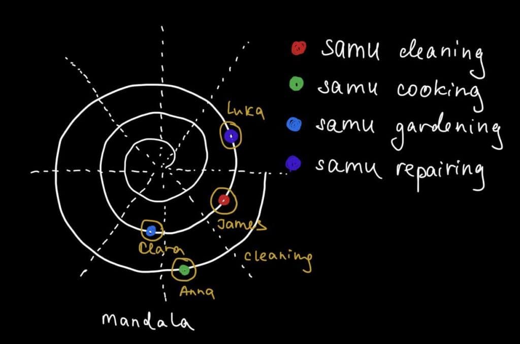 Schematic depiction of the Mandala, with participants assuming daily and weekly roles. Drawing by L. Bauer.