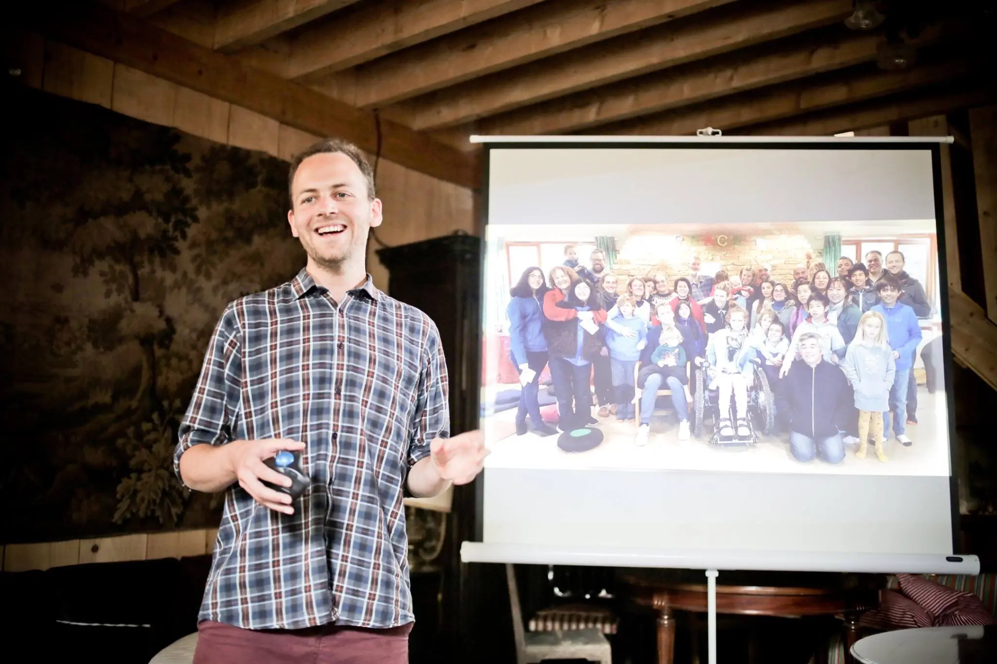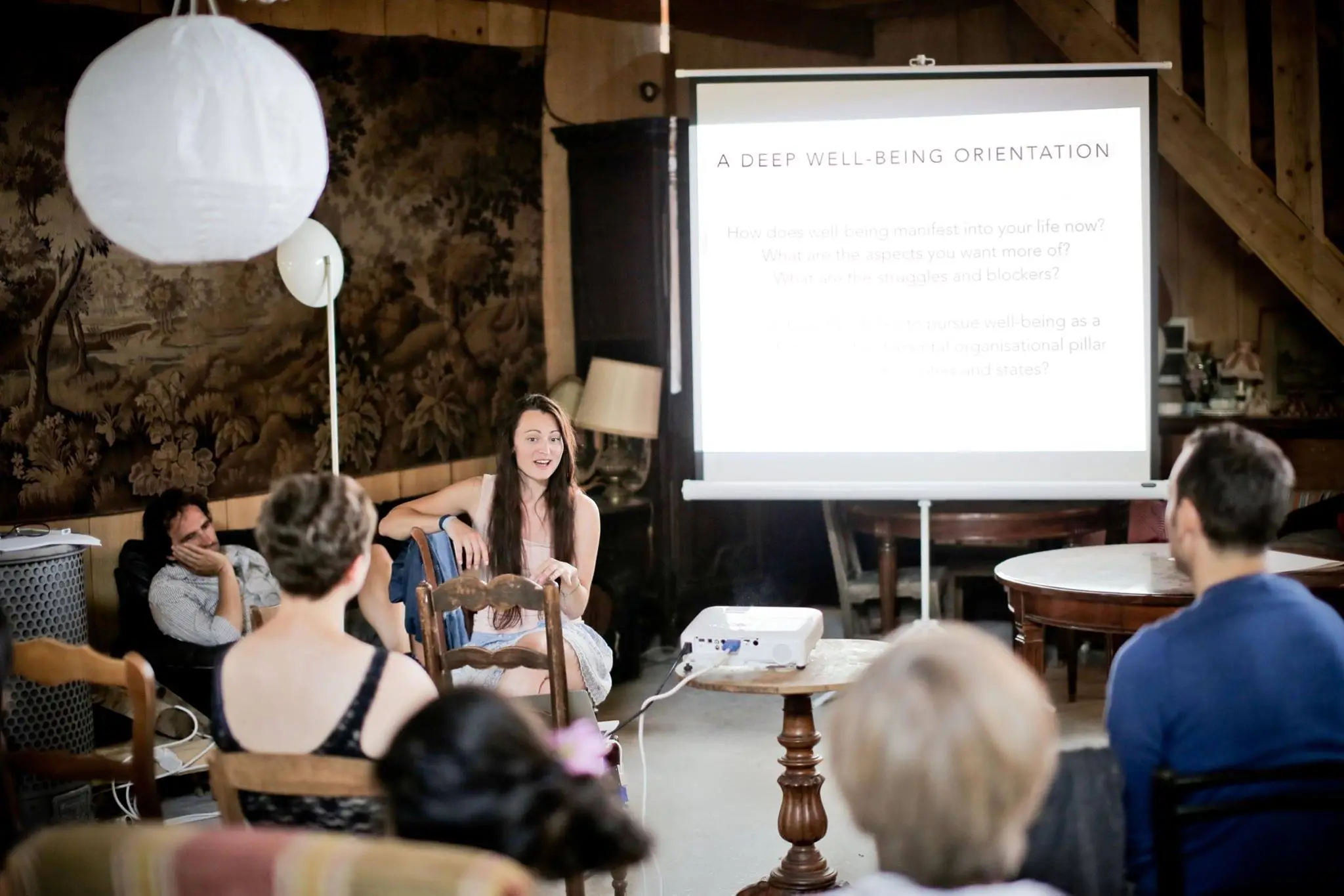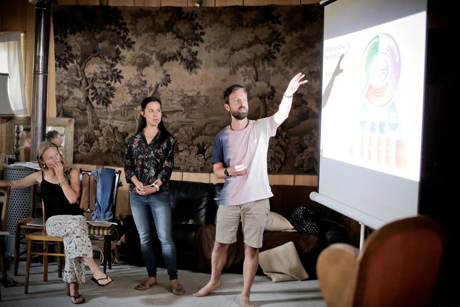 Creating this feel in the recently purchased London hub, which serves as the permanent residence of three community members and an active meeting place in London, and which was, upon its recent purchase, a monument to bland cost efficiency, was hard. Mark and Poppy vulnerably shared the tension that developed between their artistic devotion and another core value of AET “shipping on time.” Their recounting of the ultimate resolution of this tension after deep and raw communication with the community drew laughs and warmed the hearts of all present.
