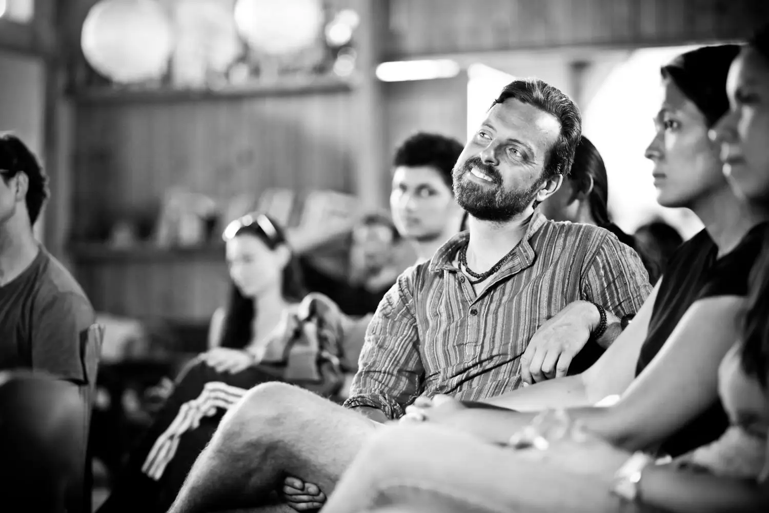 The gathering is curated with a view to balancing the intellectual and intuitive by interspersing talks and discussions with “embodiment activities” including morning meditation and yoga, blindfolded exploration and running, ecstatic dancing, meditation, sharing circles, and a workshop on healing touch. This record focuses on talks not because they are more important but because words can’t do justice to the rest.