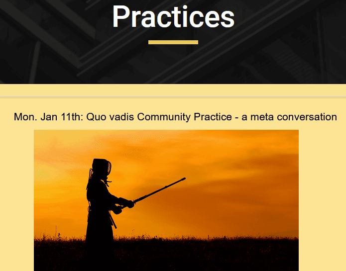 We've created a special place for everything we want to capture and make accessible. It's called The Digital Hub and it grows steadily. A recent example: After a meta-conversation where we reflected on the weekly Community practice, its purpose and how we can get even more out of it, we decided to move from two community breakfasts to breakfast + dinner, add a sign-up sheet, and also add a place where we put our Personal Practices (for easier connecting around them).